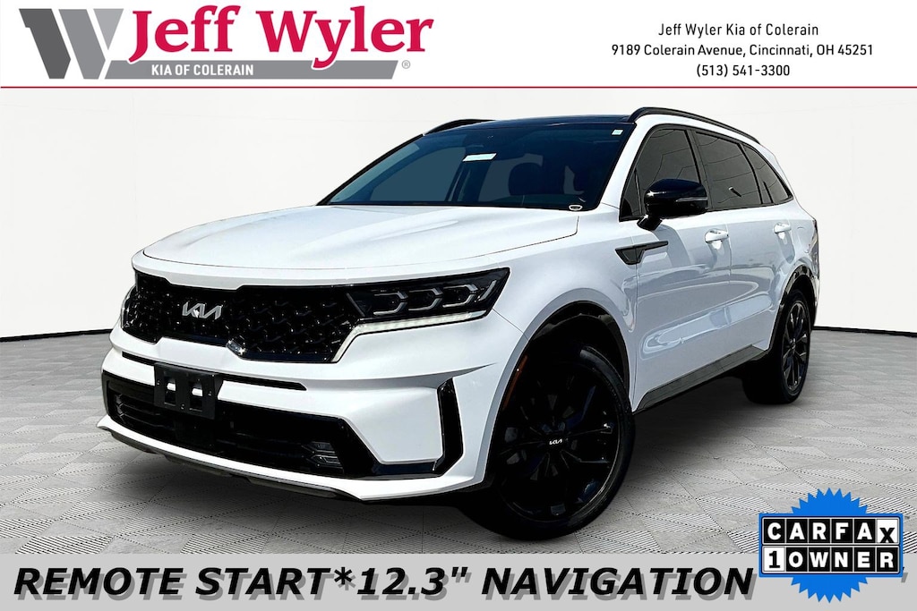 Jeff Wyler Kia of Colerain is excited to offer this attractive-looking 2023 Kia Sorento SX in Glacial White Pearl. 3.316 Axle Ratio, 3rd row seats: split-bench, 4-Wheel Disc Brakes, 6 Speakers, ABS brakes, Air Conditioning, Alloy wheels, AM/FM radio: SiriusXM, Apple CarPlay & Android Auto, Auto High-beam Headlights, Auto-dimming Rear-View mirror, Automatic temperature control, Brake assist, Bumpers: body-color, Carpet Floor Mats, Delay-off headlights, Driver door bin, Driver vanity mirror, Dual front impact airbags, Dual front side impact airbags, Electronic Stability Control, Emergency communication system, Exterior Parking Camera Rear, Four wheel independent suspension, Front anti-roll bar, Front Bucket Seats, Front Center Armrest, Front dual zone A/C, Front fog lights, Front reading lights, Fully automatic headlights, Heated door mirrors, Heated Front Bucket Seats, Heated front seats, Illuminated entry, Knee airbag, Leather steering wheel, Low tire pressure warning, Navigation System, Occupant sensing airbag, Outside temperature display, Overhead airbag, Overhead console, Panic alarm, Passenger door bin, Passenger vanity mirror, Power door mirrors, Power driver seat, Power Liftgate, Power moonroof, Power passenger seat, Power steering, Power windows, Radio data system, Radio: AM/FM Audio System, Rain sensing wipers, Rear air conditioning, Rear anti-roll bar, Rear reading lights, Rear window defroster, Rear window wiper, Remote keyless entry, Roof rack: rails only, Security system, Smart Key w/ Push Button and Remote Start, Speed control, Speed-sensing steering, Split folding rear seat, Spoiler, Steering wheel mounted audio controls, SynTex Artificial Leather Seat Trim, Tachometer, Telescoping steering wheel, Tilt steering wheel, Traction control, Trip computer, Turn signal indicator mirrors, Variably intermittent wipers, and Wheels: 8.5J x 20" Gloss Black Alloy Our PRE-OWNED vehicles are put through a rigorous 167- POINT QUALITY ASSURANCE INSPECTION along with an average amount of over $1,400.00 SPENT to recondition each vehicle so we can be sure to deliver you the highest quality vehicle like you deserve! ***ONLINE PRICE DOES NOT INCLUDE WYLER FAMILY FIRST PACKAGE***