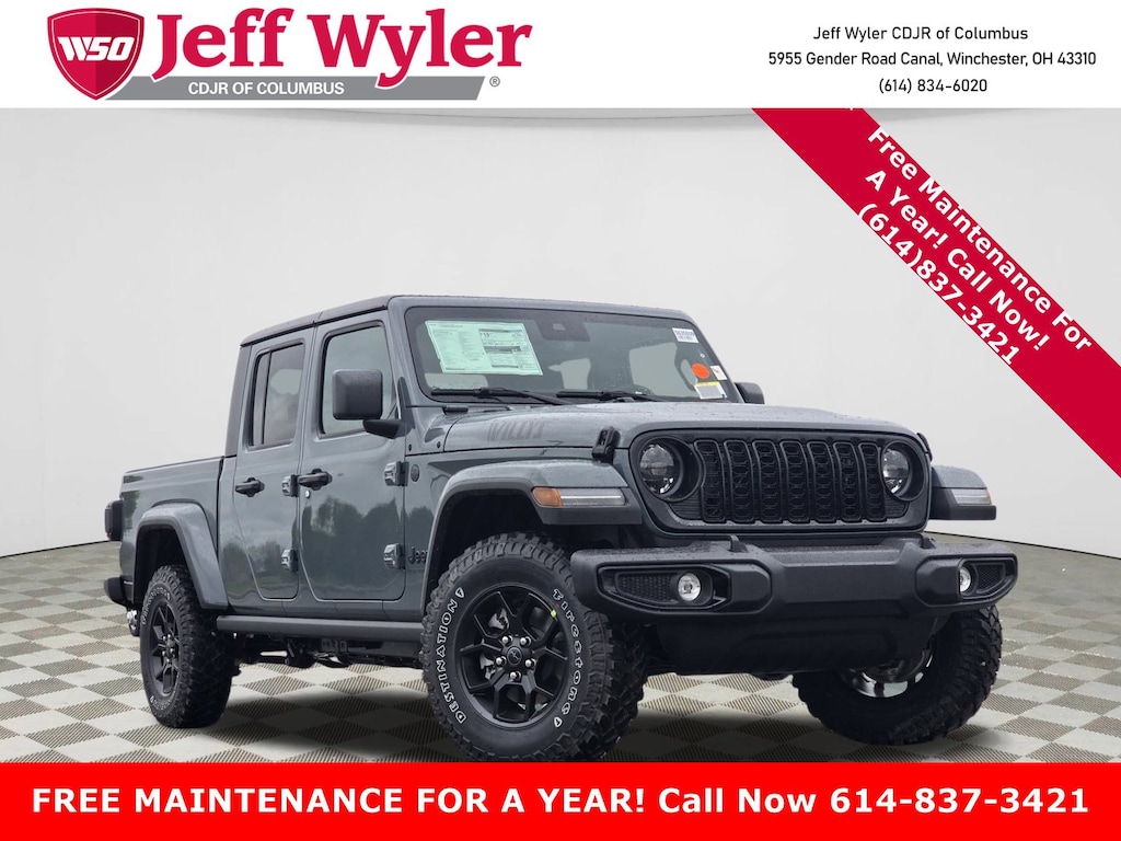 Experience Adventure with the 2025 Jeep Gladiator Willys!This rugged pickup combines legendary Jeep capability with modern convenience. The Willys edition features exclusive off-road enhancements including heavy-duty red accent shock absorbers, E-Locker rear axle, and specialized Willys suspension for conquering any terrain. Advanced Safety & Tech: Enhanced Adaptive Cruise Control, Forward Collision Warning-Plus, and Advanced Brake Assist keep you protected. Stay connected with the 12.3" touchscreen, wireless Apple CarPlay/Android Auto, and built-in 4G LTE Wi-Fi hotspot.Standout Features: Manual convertible hard top with Freedom Panel storage 285HP Pentastar V6 engine with Command-Trac 4WD Integrated navigation with voice activation Trailer-ready with Class IV hitch and sway control Exceptional Value: Take advantage of current national bonus cash incentives and competitive pricing on this well-equipped Willys edition. Why Choose Jeff Wyler Columbus? With 45+ years of trusted service and the highest online consumer ratings in Ohio Valley, we're committed to your complete satisfaction. Our comprehensive Wyler Family First Package includes 7-year appearance protection and theft deterrent coverage. Price does not include Tax, Title, License and Documentary Fee$1500 - 2025 National Stellantis Loyalty Retail Bonus Cash . Exp. 12/01/2025 $2000 - 2025 National Holiday Select Inventory Bonus Cash. Exp. 12/01/2025 $2250 - 2025 National Bonus Cash . Exp. 12/01/2025 $500 - 2025 National 2025 Military Bonus Cash. Exp. 01/05/2026