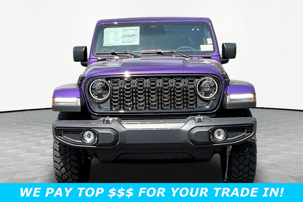 Delivers 22 Highway MPG and 17 City MPG! This Jeep Gladiator delivers a Regular Unleaded V-6 3.6 L/220 engine powering this Automatic transmission. STEEL POWER DOME HOOD PACKAGE -inc: Power Dome Dual Vented Hood, REIGN, QUICK ORDER PACKAGE 24W WILLYS -inc: 3.6L V6 24V VVT UPG I Engine w/ESS, 8-Speed Automatic 850RE Transmission, LED Taillamps, Protection Sill Rails, 4-Wheel Drive Decal, Black Grille w/Gloss Black Rings, Body Color Fender Flares (2-Piece), Front Heavy Duty Red Accent Shock Absorbers, Daytime Running Lamps LED Accents, Front LED Fog Lamps, LED Premium Reflector Headlamps, E-Locker Rear Axle, Corning Gorilla Glass, Trailer Hitch Zoom, Class IV Receiver Hitch, Security Alarm, Mold In Color Bumper w/Gloss Black, Advanced Brake Assist, Heavy Duty Engine Cooling, Automatic Headlamps, Air Conditioning w/Auto Temp Control, Deep Tint Sunscreen Windows, Off-Road Plus Mode, Willys Hood Decal, Full Speed Forward Collision Warning Plus, Rear Heavy Duty Red Accent Shock Absorbers, Front Door Locks 2-Door Passive Entry, Cluster 7.0" TFT Color Display, Power Heated Mirrors, Auxiliary Switches, Premium Wrapped Steering Wheel, Sun Visors w/Illuminated Vanity Mirrors.