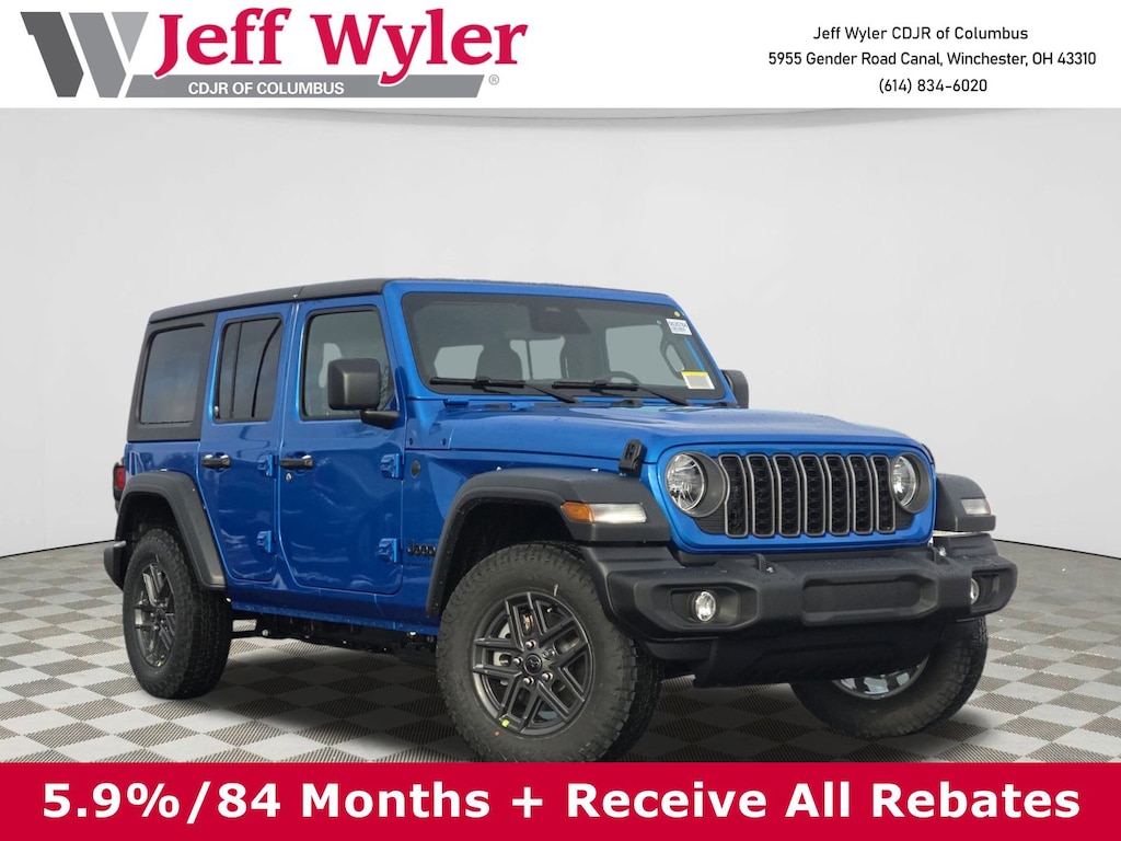 Jeff Wyler Columbus Auto Mall is proud to offer this good-looking and fun 2026 Jeep Wrangler Sport S in Hydro Blue Pearl Coat. Well equipped with: Quick Order Package 24S Sport S (Advanced Brake Assist, Automatic Headlamps, Corning Gorilla Glass, Deep Tint Sunscreen Windows, Enhanced Adaptive Cruise Control, Full Speed Forward Collision Warning Plus, Power Heated Mirrors, Premium Wrapped Steering Wheel, Security Alarm, Sun Visors with Illuminated Vanity Mirrors, and Wheels: 17" x 7.5" Gray), 12.3" Touchscreen Display, 3.45 Overall Top Gear Ratio, 4-Wheel Disc Brakes, 4G LTE Wi-Fi Hot Spot, 8 Speakers, ABS brakes, Air Conditioning, AM/FM radio: SiriusXM with 360L, Apple CarPlay, Apple CarPlay/Android Auto, Aux Battery, Black 3-Piece Hard Top, Brake assist, Compass, Connectivity - US/Canada, Delay-off headlights, Driver door bin, Driver vanity mirror, Dual front impact airbags, Dual front side impact airbags, Electronic Stability Control, For More Info, Call 800-643-2112, Freedom Panel Storage Bag, Front anti-roll bar, Front Bucket Seats, Front Center Armrest w/Storage, Front fog lights, Front reading lights, Google Android Auto, Illuminated entry, Integrated Center Stack Radio, Integrated roll-over protection, Jeep Trail Rated Kit, Low tire pressure warning, MOPAR All-Weather Floor Mats, Myflexcare Service Plan, No Soft Top, Non-Lock Fuel Cap Without Discriminator, Normal Duty Suspension, Occupant sensing airbag, Outside temperature display, Overhead airbag, Panic alarm, ParkView Rear Back-Up Camera, Passenger door bin, Passenger vanity mirror, Power steering, Power windows, Radio data system, Radio: Uconnect 5 with 12.3" Display, Rear anti-roll bar, Rear reading lights, Rear Window Defroster, Rear Window Wiper/Washer, Remote keyless entry, SiriusXM Radio Service, SiriusXM with 360L, Speed control, Split folding rear seat, Steering wheel mounted audio controls, Stop-Start Dual Battery System, Tachometer, Telescoping steering wheel, Tilt steering wheel, Traction control, Trip computer, Variably intermittent wipers, and Wheels: 17" x 7.5" Black Steel Styled.Wyler Family First Package Includes: NanoCure Appearance Protection: Exterior & Interior Chemical Sealant Applied to Protect Against Environmental Hazards (7 Year Warranty Coverage). Pulse- Rear End Collision Avoidance System Theft Deterrent Strategy gives you 5 Years of Coverage against vehicle theft, Offering up to a $5,000 benefit. Price does not include Tax, Title, License and Documentary Fee$1000 - 2026 National Retail Bonus Cash . Exp. 04/30/2026 $1000 - 2026 National Stellantis Loyalty Bonus Cash . Exp. 04/30/2026 $500 - 2026 National 2026 Military Bonus Cash . Exp. 01/04/2027