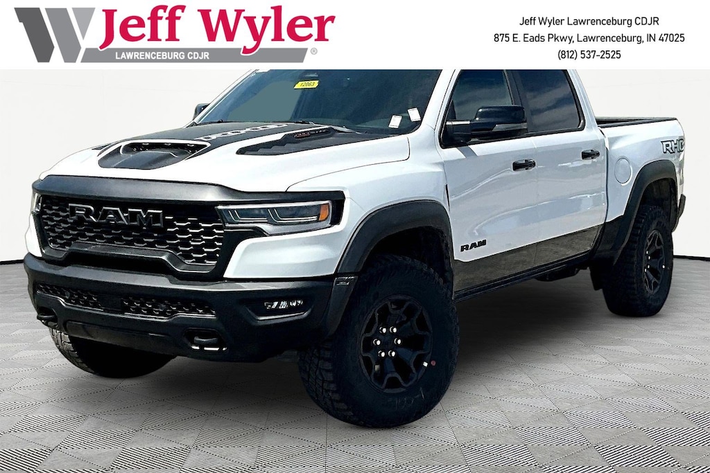Jeff Wyler Chrysler Dodge Jeep of Lawrenceburg is very proud to offer this handsome 2026 Ram 1500 RHO in Bright White Clearcoat. Well equipped with: Quick Order Package 22Y RHO, 10 Speakers, 3.92 Rear Axle Ratio, 4-Wheel Disc Brakes, 4G LTE Wi-Fi Hot Spot, ABS brakes, Adaptive suspension, Adjustable pedals, Air Conditioning, Alloy wheels, AM/FM radio, Apple CarPlay/Android Auto, Auto High-beam Headlights, Auto Power-Folding Mirrors, Auto-dimming door mirrors, Auto-Dimming Exterior Driver Mirror, Auto-dimming Rear-View mirror, Automatic temperature control, Brake assist, Compass, Connected Travel and Traffic Services, Connectivity - US/Canada, Delay-off headlights, Disassociated Touchscreen Display, Driver door bin, Driver vanity mirror, Dual front impact airbags, Dual front side impact airbags, Electronic Stability Control, Exterior Mirrors Courtesy Lamps, Exterior Mirrors with Heating Element, Exterior Mirrors with Supplemental Signals, Exterior Parking Camera Rear, Flareside Box, Front anti-roll bar, Front Bucket Seats, Front Center Armrest w/Storage, Front dual zone A/C, Front fog lights, Front reading lights, Front wheel independent suspension, Fully automatic headlights, Garage door transmitter, GPS Navigation, HD Radio, Heated door mirrors, Heated front seats, Heated steering wheel, Illuminated entry, Integrated Center Stack Radio, Integrated Voice Command with Bluetooth, Leather Shift Knob, Leather steering wheel, Leather Trimmed Bucket Seats, Low tire pressure warning, MOPAR RHO Exterior Graphics, MOPAR RHO Hood Graphics, Navigation System, Occupant sensing airbag, Outside temperature display, Overhead airbag, Overhead console, Panic alarm, Passenger door bin, Passenger vanity mirror, Power door mirrors, Power driver seat, Power passenger seat, Power steering, Power windows, Radio data system, Radio: Uconnect 5 Navigation with 12.0" Display, Rear reading lights, Rear seat center armrest, Rear step bumper, Rear window defroster, Remote keyless entry, Security system, SiriusXM Radio Service, Speed control, Split folding rear seat, Sport steering wheel, Steering wheel mounted audio controls, Tachometer, Telescoping steering wheel, Tilt steering wheel, Traction control, Trip computer, Turn signal indicator mirrors, USB Host Flip, Variably intermittent wipers, Voltmeter, and Wheels: 18" x 9" Black Paint/Polish Aluminum.Wyler Family First Package Includes: NanoCure Appearance Protection: Exterior & Interior Chemical Sealant Applied to Protect Against Environmental Hazards (7 Year Warranty Coverage). Pulse- Rear end Collision Avoidance System Theft Deterrent Strategy gives you 5 Years of Coverage against vehicle Theft, Offering up to a $5,000 benefit. Used vehicles 10 years of age or newer with less than 100,000 miles are eligible for the Wyler Assurance Program, but eligible vehicles must pass our reconditioning process and multi-point inspection. Provided the vehicle passes inspection, vehicles will be eligible for the 6 month/6,000 mile limited warranty. The 6 month/6,000 mile limited warranty is NOT available on AS-IS vehicles, wholesale vehicles, lease buyback/pass-thru vehicles or un-inspected vehicles. Note that this program can also apply to vehicles where the remaining factory coverage is less than 6 months or 6,000 miles. Please check the Federal Trade Commission (FTC) Buyers guide on the vehicle for full details as to whether or not warranty coverage may apply. Contact Dealer for additional details.The Wyler Assurance 6 month/6,000 Mile limited warranty ends 6 months from the date of the Retail Purchase Agreement (BUYERS ORDER) or when the vehicle's odometer registers 6,000 additional miles to the mileage listed on the BUYERS ORDER, whichever comes first. Your Deductible - The warranty holder on your contract pays the first $100 of each covered repair.