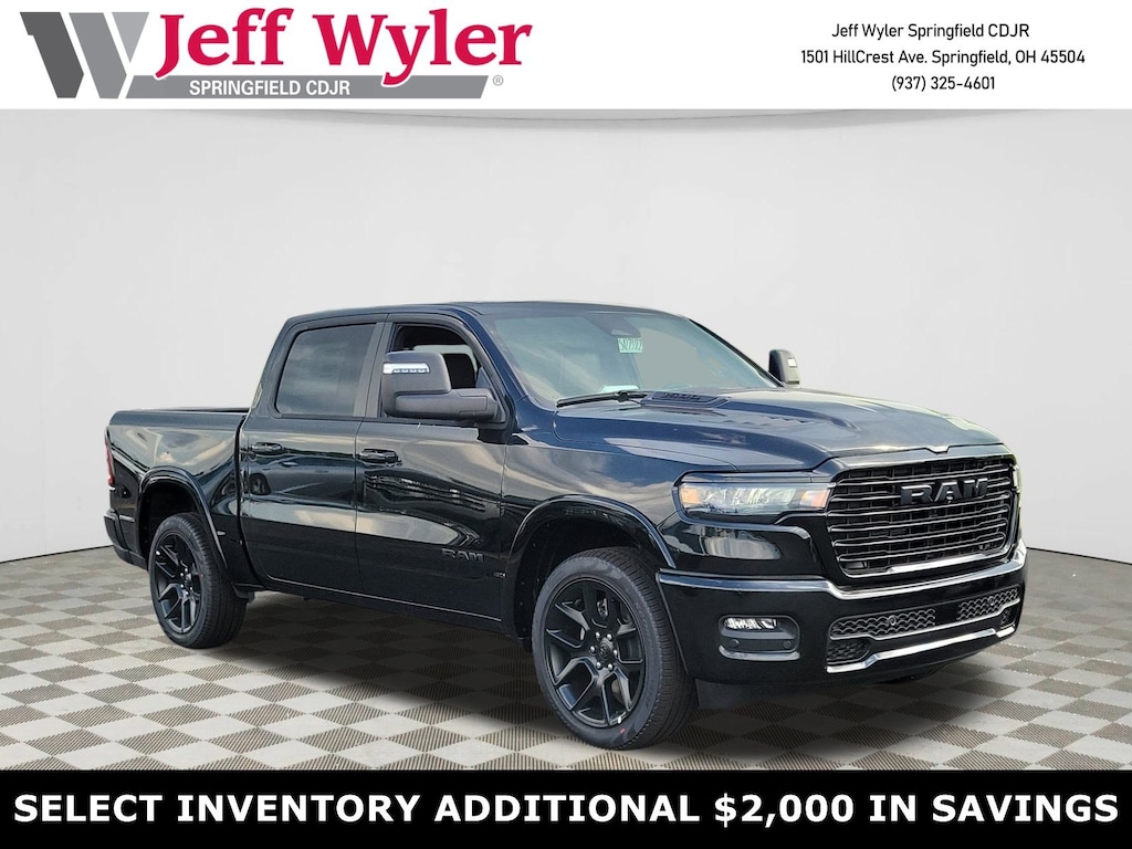 Jeff Wyler Springfield Auto Mall is honored to offer this good-looking 2026 Ram 1500 Laramie in Diamond Black Crystal Pearlcoat. Well equipped with: Advanced Safety Group II (12-Way/1-Way Trailer Connector, Active Driving Assist System, Drowsy Driver Detection, Evasive Steer Assist, Exterior Mirrors Approach Lamps, Intersection Collision Assist System, Surround View Camera System, and Traffic Sign Recognition), Laramie Level 2 Equipment Group (14.4" Touchscreen Display, 4G LTE Wi-Fi Hot Spot, Cluster 12" TFT Color Display, Connected Travel and Traffic Services, Connectivity - US/Canada, Front Passenger Interactive Display, GPS Navigation, Harman/Kardon 19 Speaker Premium Sound, Integrated Center Stack Radio, Integrated Voice Command with Bluetooth, Power Tailgate, Radio: Uconnect 5 Nav with 14.4" Display, Rain Sensitive Windshield Wipers, SiriusXM Radio Service, SiriusXM with 360L, and USB Host Flip), Night Edition (Accent Color Door Handles, Accent Color Premium Power Mirrors, Accent Color Tailgate Handle, Anti-Spin Differential Rear Axle, Auto Power-Folding Mirrors, Auto-Dimming Exterior Driver Mirror, Black Exterior Truck Badging, Black Headlamp Bezels, Black Interior Accents, Black Painted Exterior Mirrors Caps, Black Tail Lamp Bezels, Body Color Front Bumper, Body Color Rear Bumper with Step Pads, Convex Wide-Angle Exterior Mirror Insert, Dual Exhaust with Black Tips, Exterior Mirrors Courtesy Lamps, Exterior Mirrors with Heating Element, Exterior Mirrors with Memory, Exterior Mirrors with Supplemental Signals, Grille Surround 3 Black Texture 2 Black, Pirelli Brand Tires, Proximity Approach/Departure Lamps, RAM Grille Badge - Black, Sport Performance Hood, and Wheels: 22" x 9" Forged Aluminum), Quick Order Package 21H Laramie, Technology Group (Heads-Up Display and LED CHMSL Lamp), Trailer Tow Group (Trailer Brake Control, Trailer Reverse Steering Control, and Trailer Tire Pressure Monitoring System), 10 Speakers, 4-Wheel Disc Brakes, ABS brakes, Active Noise Control System, Air Conditioning, Alloy wheels, AM/FM radio: SiriusXM with 360L, Apple CarPlay/Android Auto, Audio memory, Auto High-beam Headlights, Auto-dimming door mirrors, Auto-Dimming Exterior Passenger Mirror, Auto-dimming Rear-View mirror, Automatic temperature control, Black Exterior Mirrors, Black Power-Fold Trailer Tow Mirrors, Brake assist, Bumpers: chrome, Chrome Exterior Mirrors, Compass, Delay-off headlights, Dome Dual LED Reading Lamp, Driver door bin, Driver vanity mirror, Dual front impact airbags, Dual front side impact airbags, Dual-Pane Panoramic Sunroof, E-Locker Rear Axle, Electronic Stability Control, Forward and Reverse Utility Lights, Front anti-roll bar, Front Bucket Seats, Front Center Armrest w/Storage, Front dual zone A/C, Front fog lights, Front License Plate Bracket, Front reading lights, Front wheel independent suspension, Fully automatic headlights, Garage door transmitter, Heated door mirrors, Heated front seats, Heated rear seats, Heated steering wheel, Illuminated entry, Leather steering wheel, Leather Trimmed Bucket Seats, LED Dome/Reading Lamp, Low tire pressure warning, Memory seat, Mirror Clearance/Running Lights, Navigation System, Occupant sensing airbag, Off-Road Information Pages, Outside temperature display, Overhead airbag, Overhead console, Panic alarm, ParkView Rear Back-Up Camera, Passenger door bin, Passenger vanity mirror, Power door mirrors, Power driver seat, Power passenger seat, Power steering, Power Telescoping Mirrors, Power windows, Power-Adjustable Convex Aux Mirrors, Radio data system, Radio: Uconnect 5 Navigation with 12.0" Display, RAM Grille Badge - Chrome, Rear anti-roll bar, Rear reading lights, Rear seat center armrest, Rear step bumper, Remote keyless entry, Security system, Speed control, Sp Available Incentives: $2000 - 2026 Midwest BC Conquest Bonus Cash . Exp. 01/20/2026 $3500 - 2026 National Retail Consumer Cash . Exp. 02/02/2026 $500 - 2026 National 2026 Military Bonus Cash . Exp. 01/04/2027