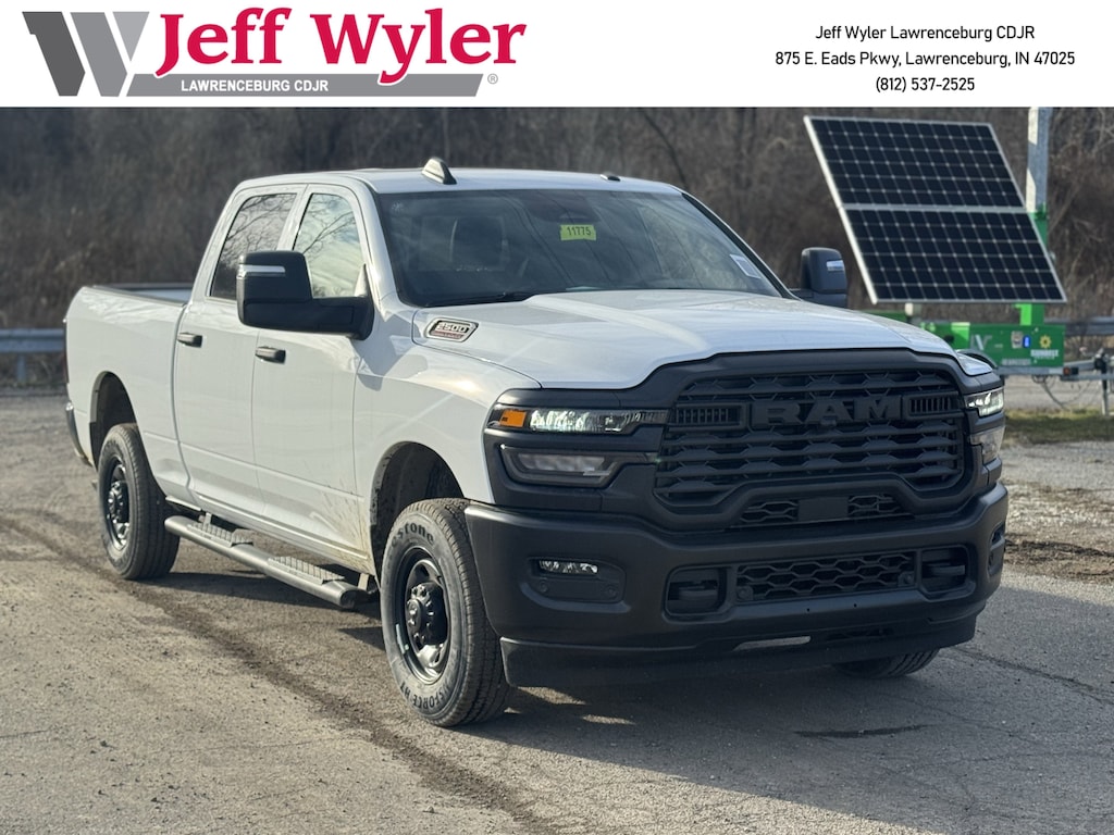 Jeff Wyler Chrysler Dodge Jeep of Lawrenceburg is very proud to offer this terrific-looking 2026 Ram 2500 Tradesman in Bright White Clearcoat. Well equipped with: Quick Order Package 2UA Tradesman, Tradesman Level 1 Equipment Group (115-Volt Auxiliary Front Power Outlet, 12" Touchscreen Display, 400W Inverter, 4G LTE Wi-Fi Hot Spot, Air Conditioning ATC with Dual Zone Control, Alexa Built-in, Anti-Spin Differential Rear Axle, Apple CarPlay, Auto-Dimming Rear-View Mirror, Connected Travel and Traffic Services, Connectivity - US/Canada, Disassociated Touchscreen Display, Emergency Vehicle Alert System (EVAS), Exterior 115V AC Outlet, For Details, Visit DriveUconnect.com, For More Info, Call 800-643-2112, Global Telematics Box Module, Google Android Auto, GPS Antenna Input, GPS Navigation, HD Radio, Integrated Voice Command with Bluetooth, Off-Road Info Pages, Radio: Uconnect 5 Navigation with 12.0" Display, Rear Power Sliding Window, Selectable Tire Fill Alert, SiriusXM Radio Service, SiriusXM with 360L, Tinted Acoustic Windshield Glass, and Trailer Tow Pages), 2 Way Rear Headrest Seat, 3.73 Axle Ratio, 4 Way Front Headrests, 4-Wheel Disc Brakes, 40/20/40 Split Bench Seat, 6 Speakers, ABS brakes, Add Vinyl Seat, Air Conditioning, AM/FM radio: SiriusXM, Apple CarPlay/Android Auto, Black Exterior Mirrors, Black Wheel Center Hub, Brake assist, Compass, Delay-off headlights, Driver door bin, Dual front impact airbags, Dual front side impact airbags, Electronic Stability Control, Front anti-roll bar, Front Armrest with Cupholders, Front Center Armrest w/Storage, Front fog lights, Front reading lights, Fully automatic headlights, Illuminated entry, Low tire pressure warning, Manual Adjust 4-Way Driver Seat, Manual Adjust 4-Way Front Passenger Seat, Manual Folding Exterior Mirrors, Manual Telescoping Mirrors, Mopar Black Tubular Side Steps, Occupant sensing airbag, Outside temperature display, Overhead airbag, Overhead console, Panic alarm, ParkView Rear Back-Up Camera, Passenger door bin, Passenger vanity mirror, Power steering, Power windows, Radio data system, Radio: Uconnect 5 with 8.4" Display, Rear anti-roll bar, Rear Folding Seat, Rear step bumper, Rear window defroster, Remote keyless entry, Remote USB Port - Charge Only, Speed control, Storage Tray, Tachometer, Tilt steering wheel, Traction control, Variably intermittent wipers, Voltmeter, and Wheels: 17" x 7.5" Black Steel StyleD.Wyler Family First Package Includes: NanoCure Appearance Protection: Exterior & Interior Chemical Sealant Applied to Protect Against Environmental Hazards (7 Year Warranty Coverage). Pulse- Rear end Collision Avoidance System Theft Deterrent Strategy gives you 5 Years of Coverage against vehicle Theft, Offering up to a $5,000 benefit. Used vehicles 10 years of age or newer with less than 100,000 miles are eligible for the Wyler Assurance Program, but eligible vehicles must pass our reconditioning process and multi-point inspection. Provided the vehicle passes inspection, vehicles will be eligible for the 6 month/6,000 mile limited warranty. The 6 month/6,000 mile limited warranty is NOT available on AS-IS vehicles, wholesale vehicles, lease buyback/pass-thru vehicles or un-inspected vehicles. Note that this program can also apply to vehicles where the remaining factory coverage is less than 6 months or 6,000 miles. Please check the Federal Trade Commission (FTC) Buyers guide on the vehicle for full details as to whether or not warranty coverage may apply. Contact Dealer for additional details.The Wyler Assurance 6 month/6,000 Mile limited warranty ends 6 months from the date of the Retail Purchase Agreement (BUYERS ORDER) or when the vehicle's odometer registers 6,000 additional miles to the mileage listed on the BUYERS ORDER, whichever comes first. Your Deductible - The warranty holder on your contract pays the first $100 Price includes: $1000 - 2026 Great Lakes BC Bonus Cash . Exp. 03/31/2026 $1000 - 2026 National Bonus Cash . Exp. 03/31/2026