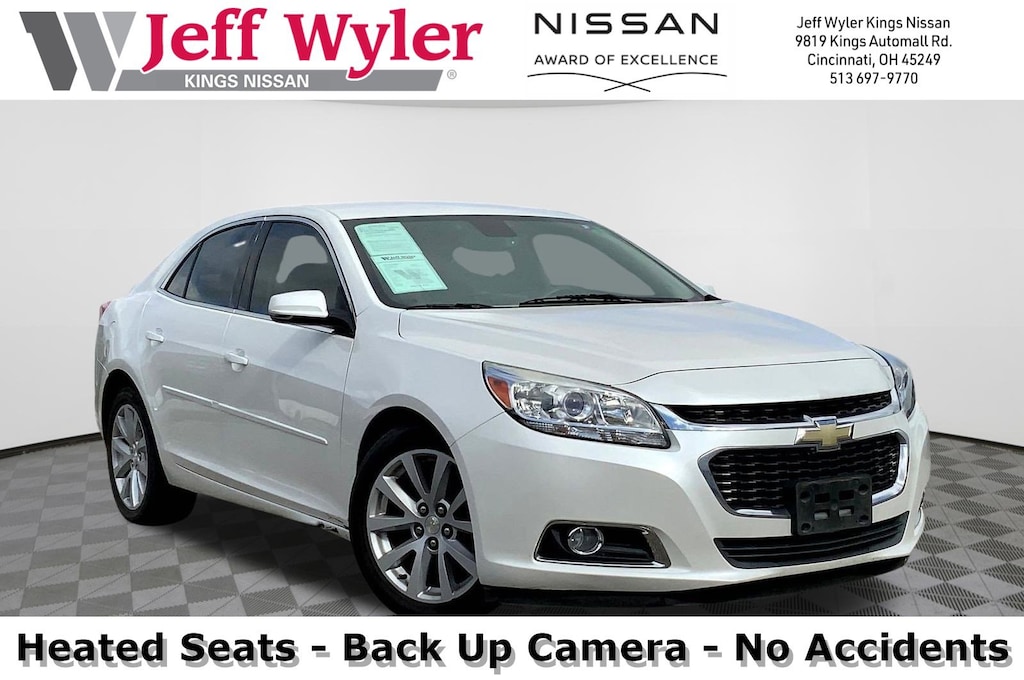 Jeff Wyler Kings Nissan is honored to offer this great-looking 2015 Chevrolet Malibu LT in Iridescent Pearl Tricoat. Well equipped with: Electronics & Entertainment Package (120-Volt Power Outlet, Body-Color Bodyside Moldings, Inside Rear-View Auto-Dimming Mirror, Pioneer Premium 9-Speaker System, Rear Vision Camera, Trunk Cargo Convenience Net, and Universal Home Remote), Leather Package (Heated Driver & Front Passenger Seats and Leather-Appointed Seat Trim), Preferred Equipment Group 2LT, Cocoa/Light Neutral Leather, 18" Aluminum Wheels, 4-Way Manual Front Passenger Seat Adjuster, 4-Wheel Disc Brakes, 6 Speakers, 7" Diagonal Touch-Screen Color Display, ABS brakes, Air Conditioning, Alloy wheels, AM/FM radio: SiriusXM, AM/FM Stereo w/CD Player & MP3 Playback, Automatic temperature control, Brake assist, Bumpers: body-color, CD player, Chevrolet MyLink, Compass, Delay-off headlights, Driver 8-Way Power Seat Adjuster, Driver door bin, Driver Power Lumbar Seat Adjuster, Driver vanity mirror, Dual front impact airbags, Dual front side impact airbags, Electronic Stability Control, Emergency communication system: OnStar Directions & Connections, Four wheel independent suspension, Front anti-roll bar, Front Bucket Seats, Front Center Armrest w/Storage, Front dual zone A/C, Front fog lights, Front reading lights, Fully automatic headlights, Heated door mirrors, Illuminated entry, Knee airbag, Leather Shift Knob, Low tire pressure warning, Occupant sensing airbag, Outside temperature display, Overhead airbag, Overhead console, Panic alarm, Passenger door bin, Passenger vanity mirror, Power door mirrors, Power driver seat, Power steering, Power windows, Premium Cloth/Leatherette Seat Trim, Radio data system, Rear anti-roll bar, Rear reading lights, Rear seat center armrest, Rear side impact airbag, Rear window defroster, Remote keyless entry, Security system, SiriusXM Satellite Radio, Speed control, Split folding rear seat, Steering wheel mounted audio controls, Tachometer, Telescoping steering wheel, Tilt steering wheel, Traction control, Trip computer, Turn signal indicator mirrors, and Variably intermittent wipers.Ask about available certifications.