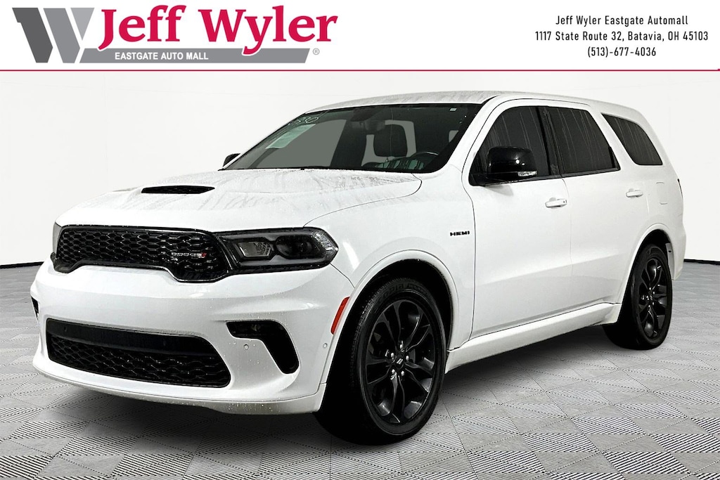 Jeff Wyler Eastgate Auto Mall is delighted to offer this good-looking 2021 Dodge Durango R/T in White Knuckle Clearcoat. Well equipped with: Blacktop Package (Gloss Black Badges, Gloss Black Exterior Mirrors, Satin Black Dodge Tail Lamp Badge, and Wheels: 20" x 8.0" Black Noise Aluminum), Quick Order Package 22S, 10.1" Touchscreen Display, 3.09 Rear Axle Ratio, 3rd row seats: split-bench, 4-Wheel Disc Brakes, 4G LTE Wi-Fi Hot Spot, 9 Speakers, ABS brakes, Air Conditioning, Alloy wheels, AM/FM radio: SiriusXM w/360L, Anti-whiplash front head restraints, Apple CarPlay, Apple CarPlay/Android Auto, Audio memory, Auto High-beam Headlights, Auto-dimming door mirrors, Auto-dimming Rear-View mirror, Auto-leveling suspension, Automatic temperature control, Brake assist, Bumpers: body-color, Compass, Connected Travel & Traffic Services, Delay-off headlights, Disassociated Touchscreen Display, Driver door bin, Driver vanity mirror, Dual front impact airbags, Dual front side impact airbags, Electronic Stability Control, Emergency communication system: SiriusXM Guardian, Four wheel independent suspension, Front anti-roll bar, Front Bucket Seats, Front Center Armrest w/Storage, Front dual zone A/C, Front fog lights, Front reading lights, Fully automatic headlights, Garage door transmitter, Global Telematics Box Module (TBM), Google Android Auto, GPS Antenna Input, GPS Navigation, HD Radio, Heated door mirrors, Heated front seats, Heated rear seats, Heated steering wheel, Heavy-Duty Engine Cooling, Hemi Badge, Illuminated entry, Integrated Center Stack Radio, Integrated Voice Command w/Bluetooth, Knee airbag, Leather steering wheel, Leather Suede Bucket Seats, Low tire pressure warning, Memory seat, Navigation system: TomTom, Occupant sensing airbag, Outside temperature display, Overhead airbag, Overhead console, Panic alarm, ParkView Rear Back-Up Camera, Passenger door bin, Passenger vanity mirror, Power door mirrors, Power driver seat, Power Liftgate, Power passenger seat, Power steering, Power windows, Radar Red Interior Accent Stitch, Radio data system, Radio: Uconnect 5 Nav w/10.1" Display, Rain sensing wipers, Rear air conditioning, Rear anti-roll bar, Rear Load Leveling Suspension, Rear reading lights, Rear seat center armrest, Rear window defroster, Rear window wiper, Remote keyless entry, Security system, SiriusXM Guardian - Included Trial (B), SiriusXM Satellite Radio, SiriusXM w/360L, Speed control, Speed-sensing steering, Speed-Sensitive Wipers, Split folding rear seat, Spoiler, Steering wheel mounted audio controls, Tachometer, Telescoping steering wheel, Tilt steering wheel, Traction control, Trip computer, Turn signal indicator mirrors, USB Host Flip, Variably intermittent wipers, Voltmeter, and Wheels: 20" x 8.0" Fine Silver. Clean CARFAX. Ask about available certifications. Used vehicles 10 years of age or newer with less than 100,000 miles are eligible for the Wyler Assurance Program, but eligible vehicles must pass our reconditioning process and multi-point inspection. Provided the vehicle passes inspection, vehicles will be eligible for the 6 month/6,000 mile limited warranty. The 6 month/6,000 mile limited warranty is NOT available on AS-IS vehicles, wholesale vehicles, lease buyback/pass-thru vehicles or un-inspected vehicles. Note that this program can also apply to vehicles where the remaining factory coverage is less than 6 months or 6,000 miles. Please check the Federal Trade Commission (FTC) Buyers guide on the vehicle for full details as to whether or not warranty coverage may apply. Contact Dealer for additional details. The Wyler Assurance 6 month/6,000 Mile limited warranty ends 6 months from the date of the Retail Purchase Agreement (BUYERS ORDER) or when the vehicle's odometer registers 6,000 additional miles to the mileage listed on the BUYERS ORDER, whichever comes first. Your Deductible - The warranty holder on your contract pays the first $100 of each covered repair.