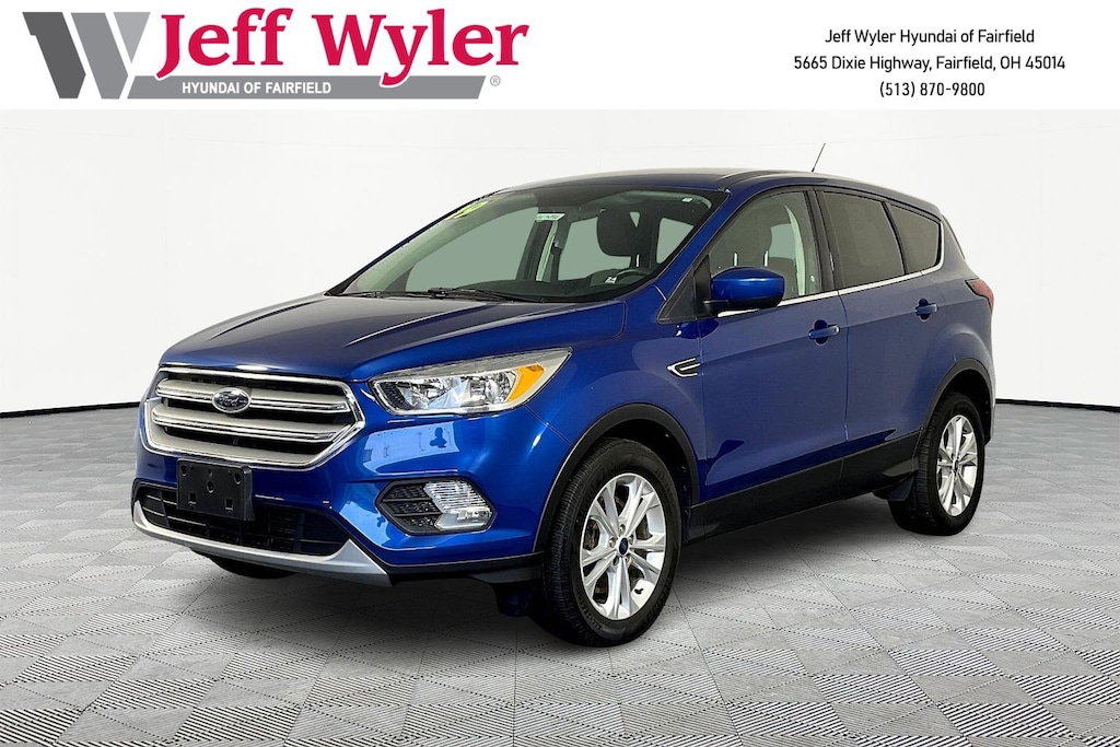 Clean CARFAX. Jeff Wyler Hyundai of Fairfield is proud to offer this fantastic 2019 Ford Escape SE in Lightning Blue Metallic. Well equipped with: Equipment Group 200A, 4WD, Android Auto, Apple CarPlay, CALL NOW FOR YOUR VIP APPOINTMENT 513-870-9800, FULLY SERVICED w/RECORDS, GUARANTEED FINANCING!! NO MATTER YOUR SITUATION WE CAN GET AN APPROVAL!!, THE #1 Volume dealer in the region! Come see why for yourself Today!!, WE PAY MORE FOR YOUR TRADE!!, 3.51 Axle Ratio, 4-Wheel Disc Brakes, 6 Speakers, ABS brakes, Air Conditioning, Alloy wheels, AM/FM radio: SiriusXM, AppLink/Apple CarPlay and Android Auto, Automatic temperature control, Brake assist, Bumpers: body-color, Compass, Delay-off headlights, Driver door bin, Driver vanity mirror, Dual front impact airbags, Dual front side impact airbags, Electronic Stability Control, Emergency communication system: SYNC 3 911 Assist, Exterior Parking Camera Rear, FordPass Connect, Four wheel independent suspension, Front anti-roll bar, Front Bucket Seats, Front Center Armrest, Front dual zone A/C, Front fog lights, Front reading lights, Fully automatic headlights, Heated front seats, Heated Unique Cloth Front Bucket Seats, Illuminated entry, Knee airbag, Low tire pressure warning, Occupant sensing airbag, Outside temperature display, Overhead airbag, Overhead console, Panic alarm, Passenger door bin, Passenger vanity mirror, Power door mirrors, Power driver seat, Power steering, Power windows, Radio data system, Radio: AM/FM Stereo w/MP3 Capable, Rear anti-roll bar, Rear seat center armrest, Rear window defroster, Rear window wiper, Remote keyless entry, Security system, Speed control, Speed-sensing steering, Split folding rear seat, Steering wheel mounted audio controls, SYNC 3 Communications & Entertainment System, Tachometer, Telescoping steering wheel, Tilt steering wheel, Traction control, Trip computer, Variably intermittent wipers, and Wheels: 17" Sparkle Silver-Painted Aluminum. TO CHECK ON THE AVAILABILITY OF THIS VEHICLE REACH OUT TO ONE OF OUR TEAM MEMBERS!! ALSO SHOP ONLINE AT https://www.jeffwylerhyundaioffairfield.com/ Proudly Serving: Cincinnati, Dayton, Columbus, Louisville, Lexington, Indianapolis, Hamilton, Florence, Alexandria, Beavercreek, Springdale, West Chester, Monroe, Fairfield, Kenwood, Newport and all of greater Cincinnati Ohio, Indiana, and Northern Kentucky.