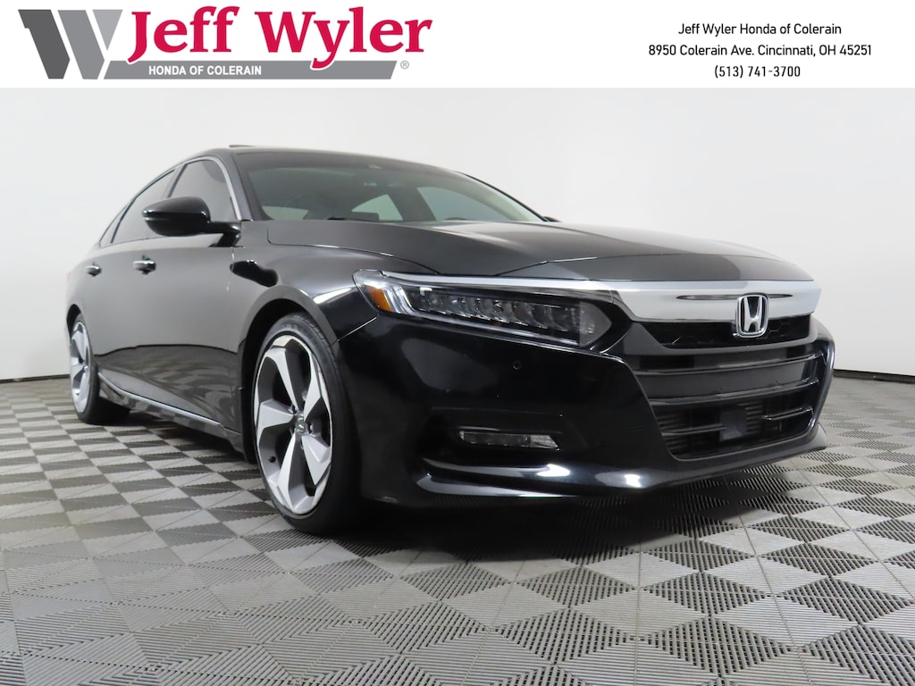 Jeff Wyler Honda of Colerain is very proud to offer this handsome 2018 Honda Accord Touring in Black. Well equipped with: 10 Speakers, 4-Wheel Disc Brakes, ABS brakes, Adaptive suspension, Air Conditioning, Alloy wheels, AM/FM radio: SiriusXM, Apple CarPlay/Android Auto, Auto High-beam Headlights, Auto-dimming Rear-View mirror, Automatic temperature control, Blind Spot Information (BSI) System warning, Brake assist, Bumpers: body-color, Compass, Delay-off headlights, Driver door bin, Driver vanity mirror, Dual front impact airbags, Dual front side impact airbags, Electronic Stability Control, Emergency communication system: HondaLink, Exterior Parking Camera Rear, Four wheel independent suspension, Front anti-roll bar, Front Bucket Seats, Front Center Armrest, Front dual zone A/C, Front fog lights, Front reading lights, Fully automatic headlights, Garage door transmitter: HomeLink, Heads-Up Display, Heated & Ventilated Front Bucket Seats, Heated door mirrors, Heated front seats, Heated rear seats, Illuminated entry, Knee airbag, Leather Shift Knob, Leather steering wheel, Leather-Trimmed Seats, Low tire pressure warning, Memory seat, Navigation System, Occupant sensing airbag, Outside temperature display, Overhead airbag, Overhead console, Panic alarm, Passenger door bin, Passenger vanity mirror, Power door mirrors, Power driver seat, Power moonroof, Power passenger seat, Power steering, Power windows, Radio data system, Radio: 450-Watt AM/FM/HD Premium Audio System, Rain sensing wipers, Rear anti-roll bar, Rear seat center armrest, Rear window defroster, Remote keyless entry, Security system, Speed control, Speed-sensing steering, Speed-Sensitive Wipers, Split folding rear seat, Steering wheel mounted audio controls, Tachometer, Telescoping steering wheel, Tilt steering wheel, Traction control, Trip computer, Turn signal indicator mirrors, Variably intermittent wipers, Ventilated front seats, and Wheels: 19" Machine-Finished Alloy w/Gray Inserts.