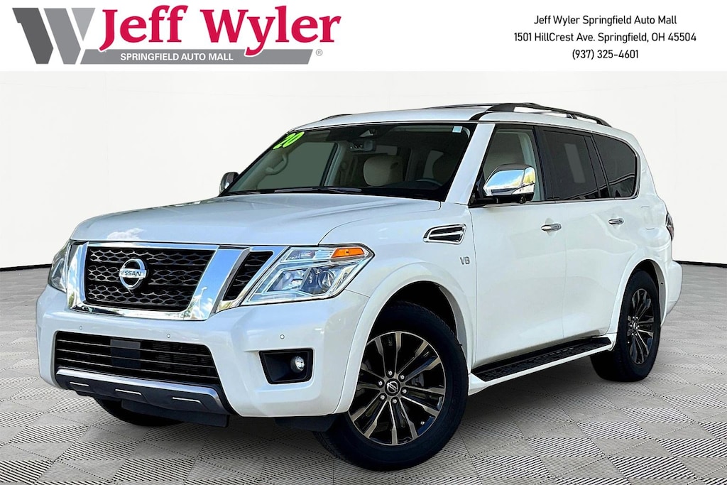 Jeff Wyler Springfield Auto Mall is honored to offer this outstanding 2020 Nissan Armada Platinum in Pearl White Tricoat. Well equipped with: Captain's Chairs Package (2nd Row Captain's Chairs and 2nd Row Center Console w/Padded Armrest), Cargo Package, 13 Speakers, 3rd Row Carpeted Floor Mats - Captain Seat, 3rd row seats: split-bench, 4-Wheel Disc Brakes, A/V remote, ABS brakes, Air Conditioning, Alloy wheels, AM/FM radio: SiriusXM, Anti-whiplash front head restraints, Auto tilt-away steering wheel, Auto-dimming door mirrors, Auto-dimming Rear-View mirror, Auto-leveling suspension, Automatic temperature control, Axle Ratio: 2.94, Brake assist, Bumpers: body-color, CD player, Cross Bars, Delay-off headlights, Driver door bin, Driver vanity mirror, Dual front impact airbags, Dual front side impact airbags, DVD-Audio, Electronic Stability Control, Emergency communication system: NissanConnect Services, Exterior Parking Camera Rear, Four wheel independent suspension, Front anti-roll bar, Front Bucket Seats, Front Center Armrest, Front dual zone A/C, Front fog lights, Front reading lights, Fully automatic headlights, Garage door transmitter: HomeLink, Headphones, Heated & Cooled Front Bucket Seats, Heated door mirrors, Heated front seats, Heated rear seats, Heated steering wheel, Illuminated entry, Illuminated Kick Plates, Leather Shift Knob, Leather-Appointed Seat Trim, Low tire pressure warning, Memory seat, Navigation System, Occupant sensing airbag, Outside temperature display, Overhead airbag, Overhead console, Panic alarm, Passenger door bin, Passenger vanity mirror, Power door mirrors, Power driver seat, Power Liftgate, Power moonroof, Power passenger seat, Power steering, Power windows, Radio data system, Radio: AM/FM/SXM/CD/MP3/HD, Rain sensing wipers, Rear air conditioning, Rear anti-roll bar, Rear reading lights, Rear seat center armrest, Rear window defroster, Rear window wiper, Reclining 3rd row seat, Remote keyless entry, Security system, Special Paint - Pearl White, Speed control, Speed-sensing steering, Speed-Sensitive Wipers, Split folding rear seat, Spoiler, Steering wheel memory, Steering wheel mounted audio controls, Tachometer, Telescoping steering wheel, Tilt steering wheel, Traction control, Trip computer, Turn signal indicator mirrors, Variably intermittent wipers, Ventilated front seats, Voltmeter, and Wheels: 20" Machine-Faced w/Tinted Clear Coat. Ask about available certifications. Used vehicles 10 years of age or newer with less than 100,000 miles are eligible for the Wyler Assurance Program, but eligible vehicles must pass our reconditioning process and multi-point inspection. Provided the vehicle passes inspection, vehicles will be eligible for the 6 month/6,000 mile limited warranty. The 6 month/6,000 mile limited warranty is NOT available on AS-IS vehicles, wholesale vehicles, lease buyback/pass-thru vehicles or un-inspected vehicles. Note that this program can also apply to vehicles where the remaining factory coverage is less than 6 months or 6,000 miles. Please check the Federal Trade Commission (FTC) Buyers guide on the vehicle for full details as to whether or not warranty coverage may apply. Contact Dealer for additional details. The Wyler Assurance 6 month/6,000 Mile limited warranty ends 6 months from the date of the Retail Purchase Agreement (BUYERS ORDER) or when the vehicle's odometer registers 6,000 additional miles to the mileage listed on the BUYERS ORDER, whichever comes first. Your Deductible - The warranty holder on your contract pays the first $100 of each covered repair.