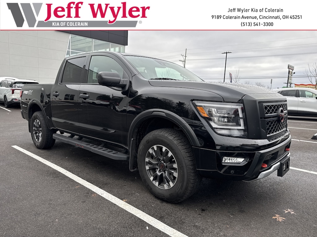Jeff Wyler Kia of Colerain is excited to offer this wonderful-looking 2024 Nissan Titan PRO-4X in Super Black. PRO-4X Utility Package, 3.692 Axle Ratio, 4-Wheel Disc Brakes, 6 Speakers, ABS brakes, Air Conditioning, Alloy wheels, AM/FM radio: SiriusXM, Apple CarPlay/Android Auto, Auto High-beam Headlights, Auto-dimming Rear-View mirror, Auto-leveling suspension, Automatic temperature control, Bed Assist Grip, Blind Spot Warning, Brake assist, Cloth Seat Trim w/Vinyl Bolsters, Compass, Delay-off headlights, Driver door bin, Driver vanity mirror, Dual front impact airbags, Dual front side impact airbags, Electronic Stability Control, Emergency communication system: NissanConnect Services, Front anti-roll bar, Front Bucket Seats, Front Captain's Seats, Front Center Armrest, Front dual zone A/C, Front fog lights, Front reading lights, Front wheel independent suspension, Fully automatic headlights, Garage door transmitter: HomeLink, Heated door mirrors, Illuminated entry, Knee airbag, Leather steering wheel, Low tire pressure warning, Navigation system: NissanConnect with Navigation and Services, Occupant sensing airbag, Outside temperature display, Overhead airbag, Overhead console, Panic alarm, Passenger door bin, Passenger vanity mirror, Power door mirrors, Power driver seat, Power steering, Power windows, PRO-4X Badged Floor Mats, PRO-4X Illuminated Kick Plate, PRO-4X Mud Flaps, PRO-4X Rugged Step Boards, Radio data system, Radio: NissanConnect w/Navigation, Rain sensing wipers, Rear anti-roll bar, Rear Bumper Step w/Electronic Tailgate Lock, Rear Parking Sensors, Rear reading lights, Rear seat center armrest, Rear step bumper, Rear Underseat Storage, Rear window defroster, Remote keyless entry, Security system, Speed control, Speed-sensing steering, Speed-Sensitive Wipers, Split folding rear seat, Steering wheel mounted audio controls, Tachometer, Telescoping steering wheel, Tilt steering wheel, Traction control, Trip computer, Variably intermittent wipers, Voltmeter, and Wheels: 18" x 8" Painted Dark Finish Alloy Our PRE-OWNED vehicles are put through a rigorous 167- POINT QUALITY ASSURANCE INSPECTION along with an average amount of over $1,400.00 SPENT to recondition each vehicle so we can be sure to deliver you the highest quality vehicle like you deserve! ***ONLINE PRICE DOES NOT INCLUDE WYLER FAMILY FIRST PACKAGE***